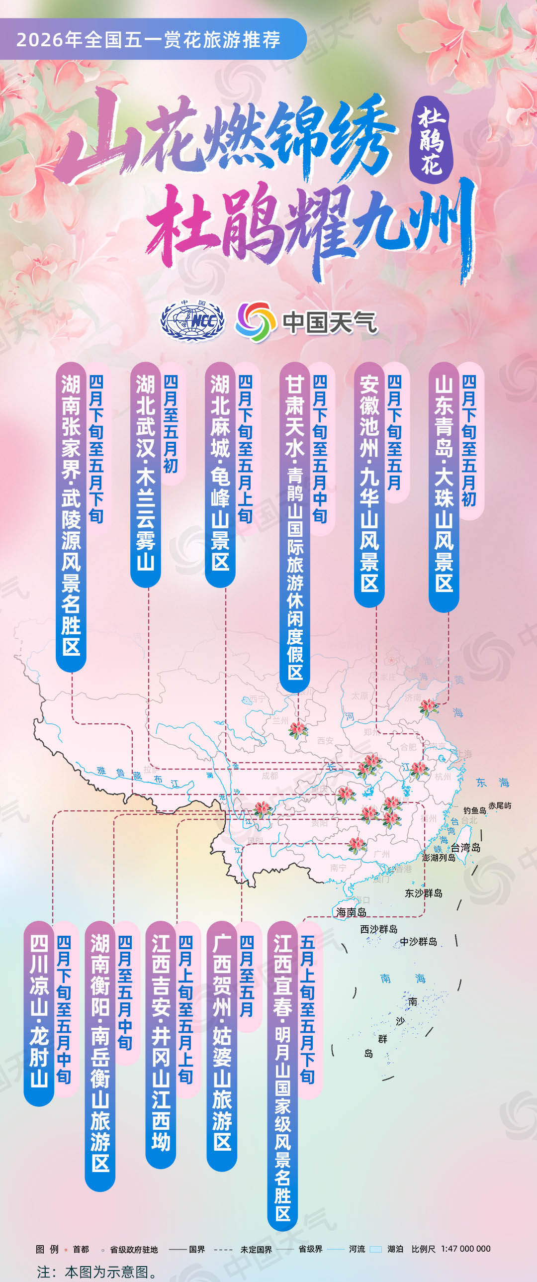 国家气候中心等结合赏花花品类型、盛开气候条件、4月下旬至5月上旬气候趋势预测等,选出涵盖6大类花品及10种特色花的全国赏花旅游景点作为推荐内容,涉及21个省(自治区、直辖市)的43个地市,包含东北、华北、西北、华中、华东、西南、华南等区域,并结合各地小气候差异定向选点。