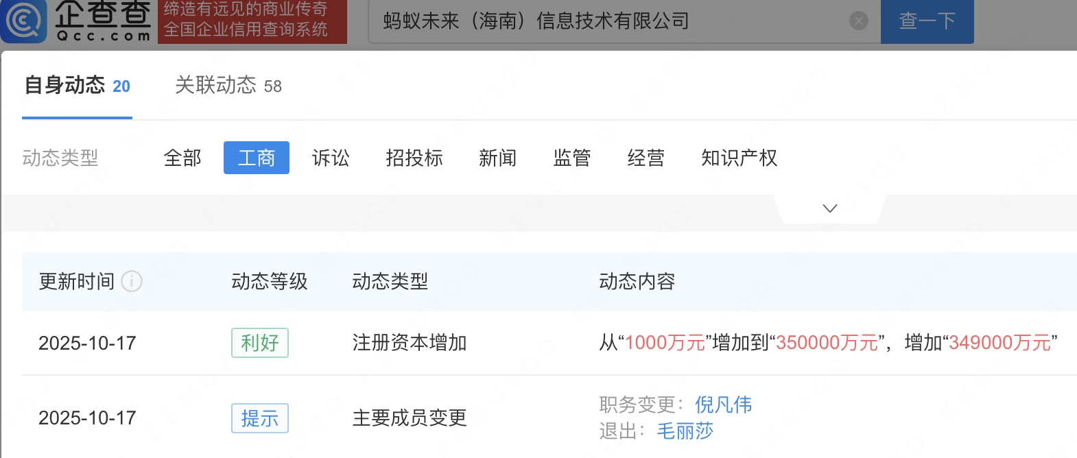 近日,蚂蚁未来(海南)信息技术有限公司发生工商变更,注册资本由1000万人民币增至35亿人民币。企查查信息显示,该公司成立于2018年,法定代表人为倪凡伟,经营范围包括信息技术咨询服务、软件开发与设计、接受金融机构委托从事金融信息技术外包等,由蚂蚁科技集团股份有限公司间接全资持股。