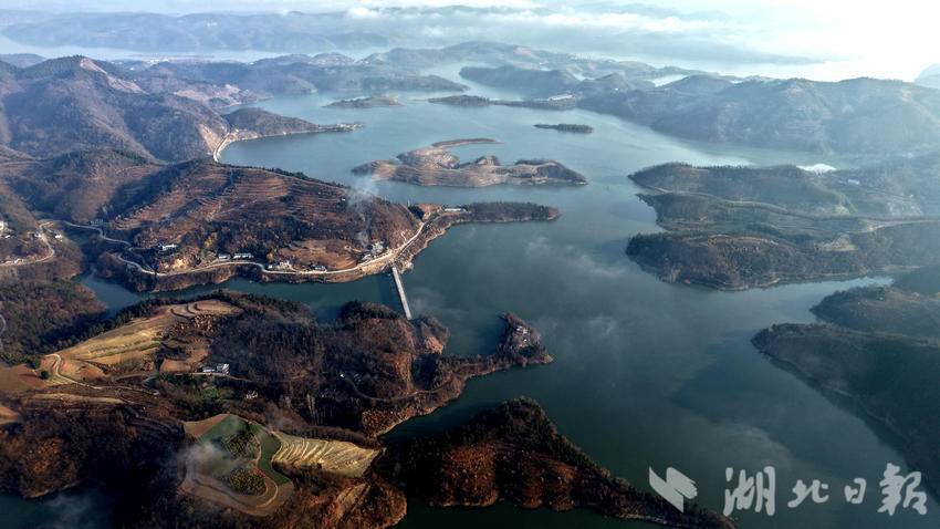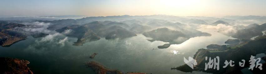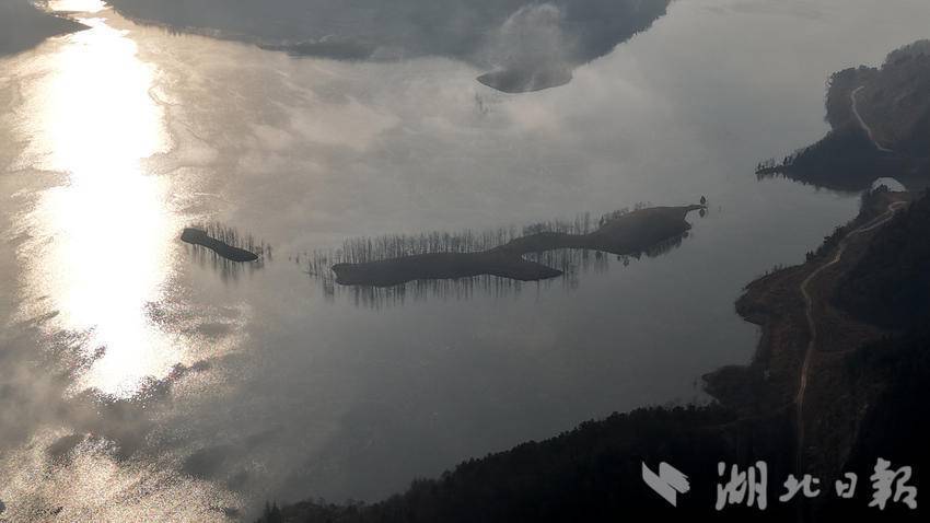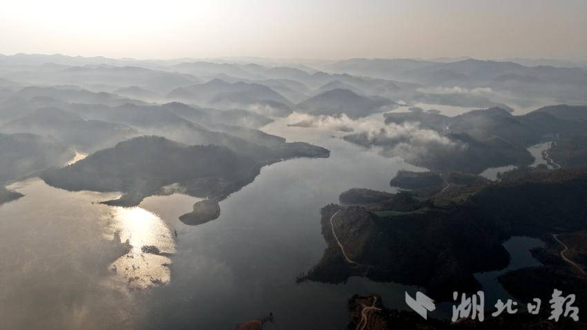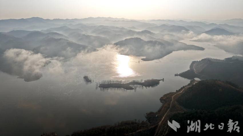 湖北日报客户端讯(通讯员李尚菲)12月26日,航拍流经郧阳区青山镇钱家河村的泗河,晨光熹微之时,云雾缭绕,金波微漾,梯田如画,宛若仙境。眼下,南水北调中线工程核心水源地丹江口水库仍处于高水位,上游汉江一级支流泗河水位上升,形成众多小岛,在晨雾笼罩下,格外迷人,如诗如画。