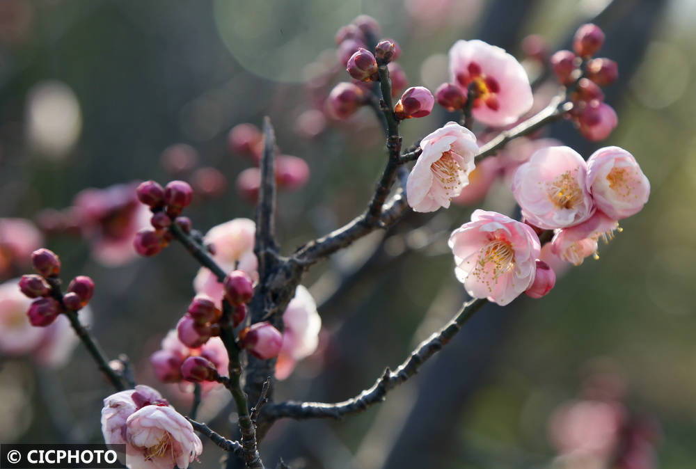 ↑2025年12月27日在河南省洛阳市汝阳县滨河公园西段北岸拍摄的梅花。CICPHOTO/康红军 摄