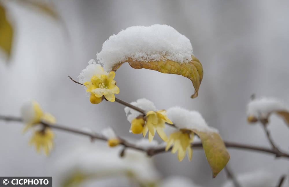 ↑2025年12月13日在山东省滕州市荆河公园拍摄的雪后腊梅。CICPHOTO/彭慧英 摄
