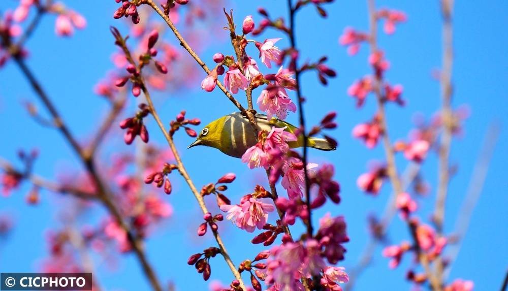↑2025年12月23日,一只绣眼鸟在云南省红河哈尼族彝族自治州弥勒市甸溪河湿地公园的冬樱花枝头停歇。CICPHOTO/普佳勇 摄