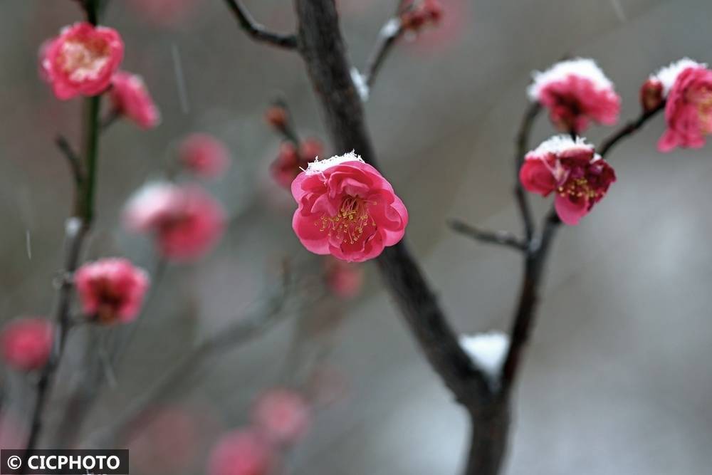 ↑2025年12月12日在河南省济源市承留镇花石村拍摄的雪中红梅。CICPHOTO/卢天祥 摄