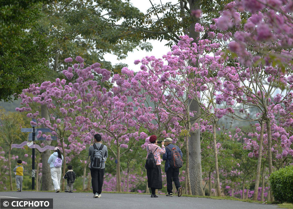 ↑2025年12月6日,游客在广西南宁园博园观赏紫花风铃木。CICPHOTO/滕忠 摄