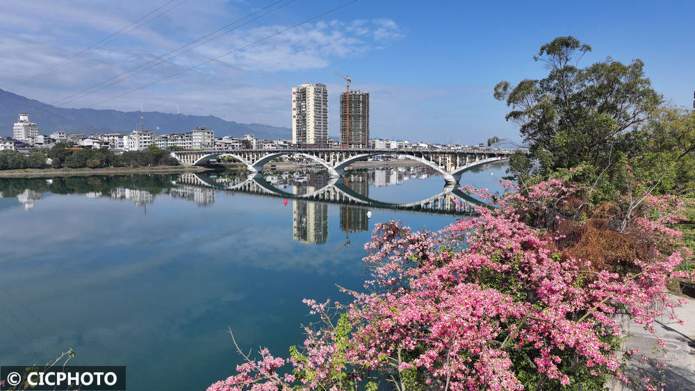 ↑2025年12月15日在融江广西柳州市融安县城段河堤拍摄的异木棉花。(无人机照片)CICPHOTO/谭克兴 摄
