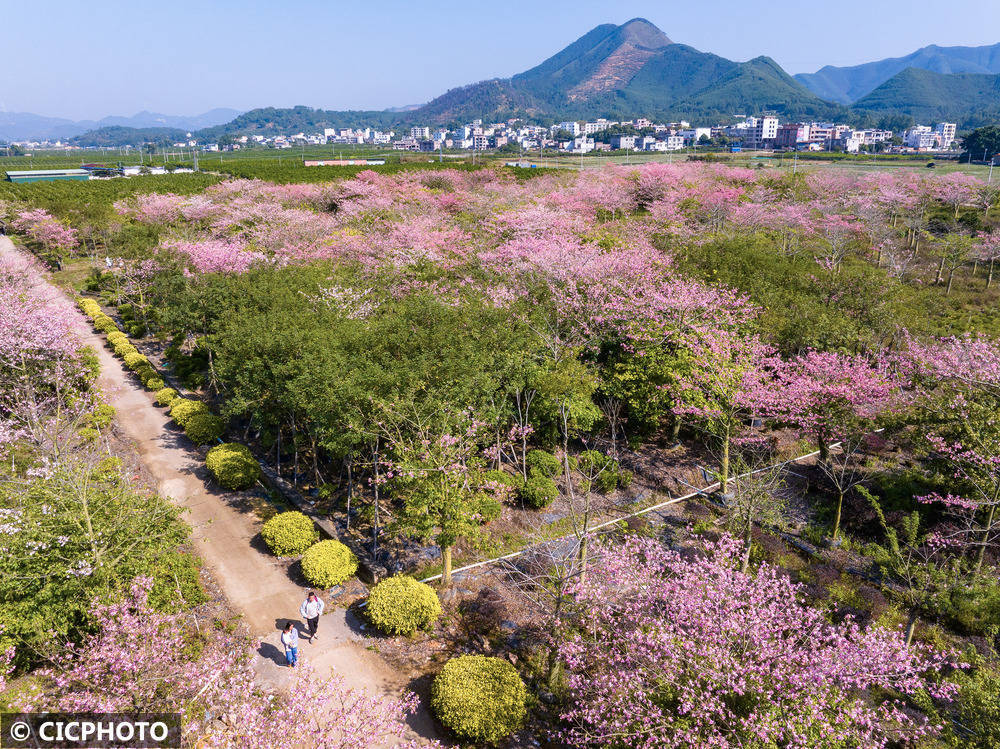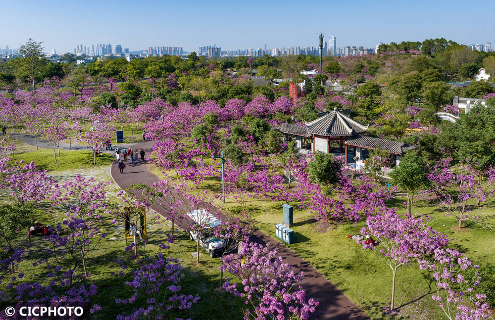 ↑2025年12月14日,游客在广西南宁园博园观赏紫花风铃木。(无人机照片)CICPHOTO/曾祥忠 摄