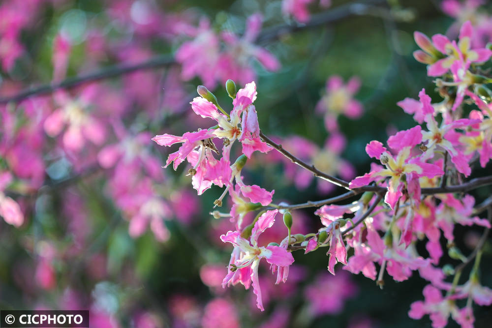 ↑2025年12月15日在广西梧州市玫瑰湖公园拍摄的异木棉花。CICPHOTO/林志清 摄