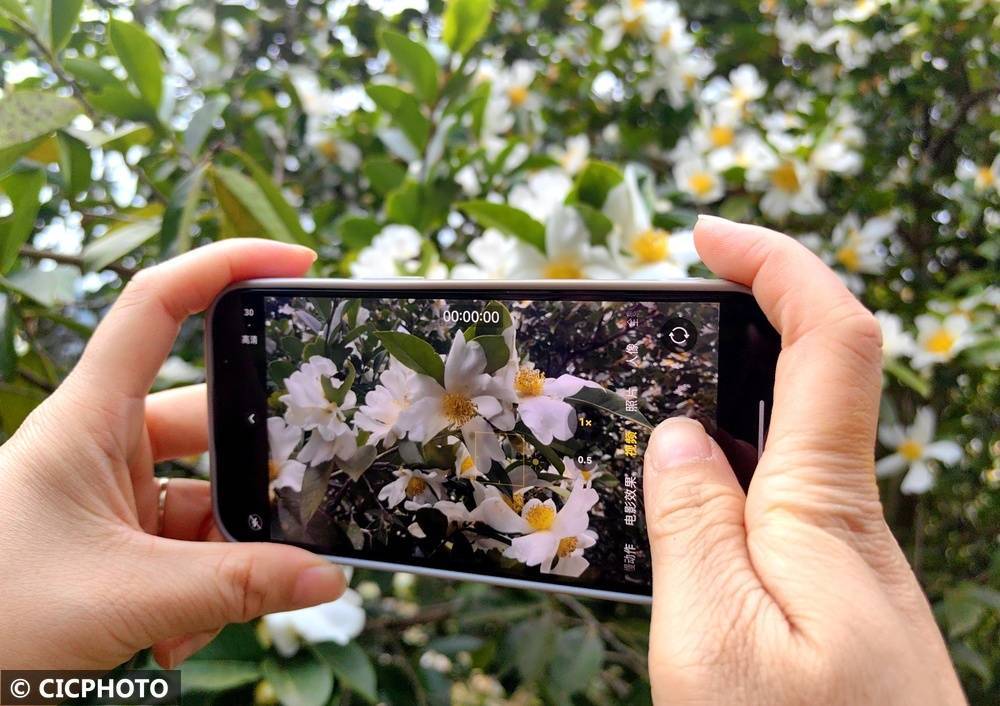 ↑2025年12月20日,游客在广西来宾市忻城县古蓬镇内联村油茶花旁赏花拍照。CICPHOTO/樊绍光 摄