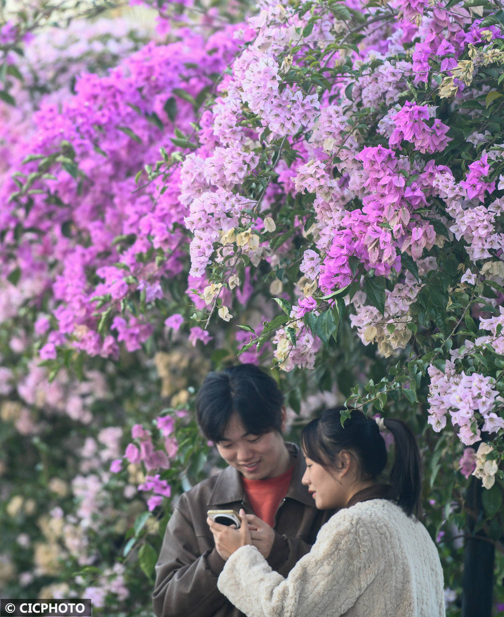 ↑2025年11月22日,湖南省永州市道县富塘街道五侯社区三角梅盛开,游客在赏花拍照。CICPHOTO/蒋克青 摄