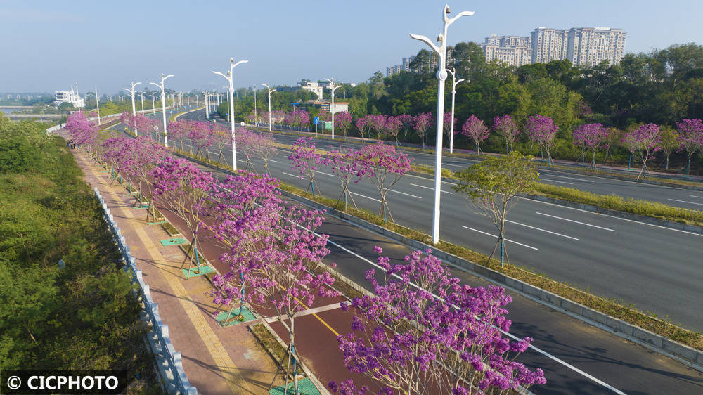 ↑2025年12月19日在广西北海市廉州湾大道旁拍摄的紫花风铃木。(无人机照片)CICPHOTO/李君光 摄